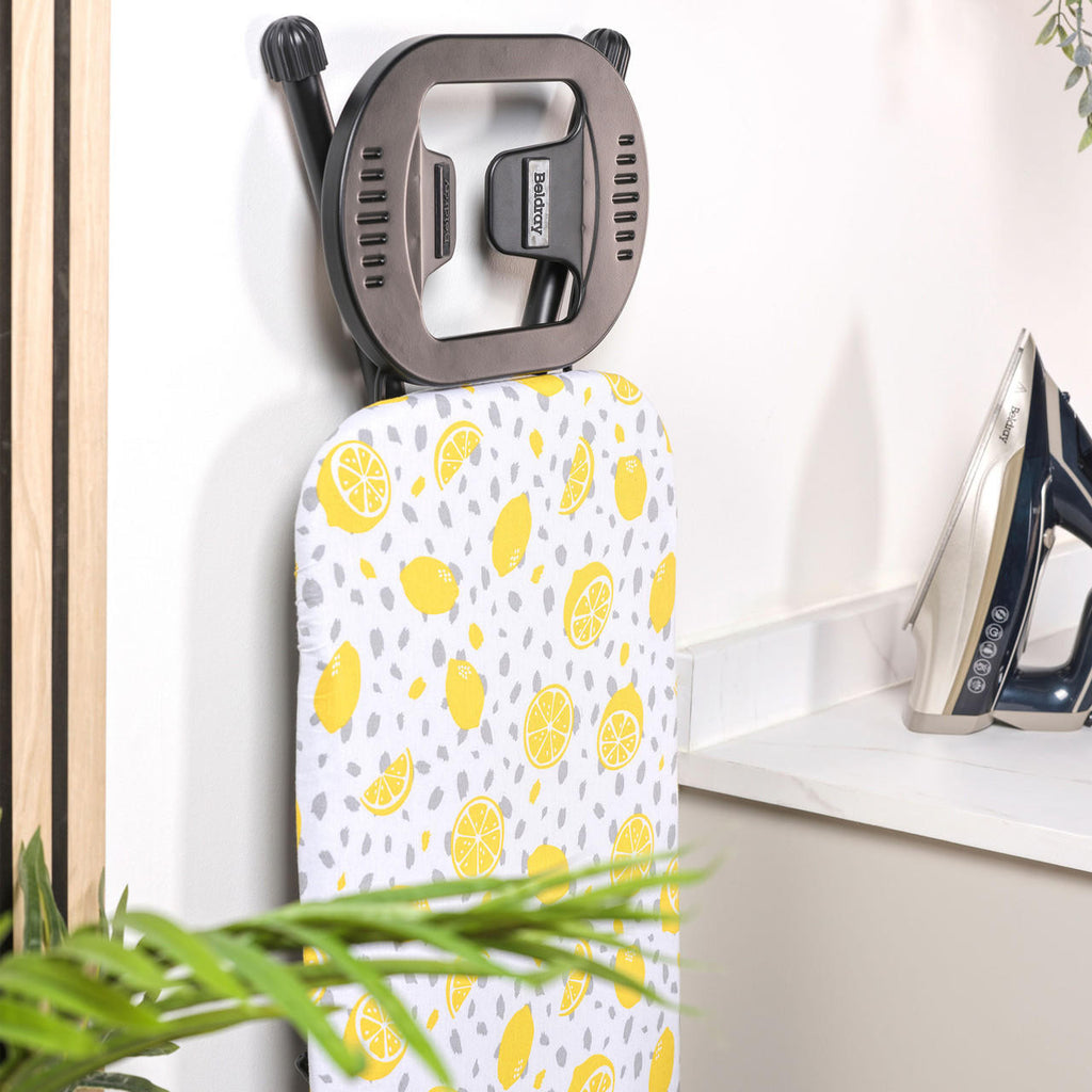 This Beldray ironing board combines the convenience of a folding collapsible design, so you can easily store it away, with the utility of a sturdy board. With 7 variable height options so you can iron in comfort and an adjustable iron rest to suit different sized irons, you can easily customize your ironing experience. The board's thick felt underlay helps produce a smooth press for effortless crease removal, and the lemon-print machine washable cover adds a bright touch to your laundry routine.
