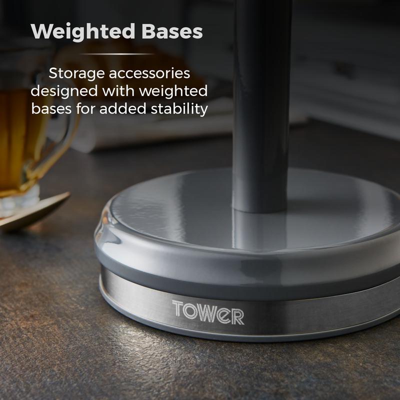 This Tower Belle mug tree and towel pole set provides an elegant storage solution for your cups and kitchen roll. The pair features a co-ordinating Parisian design with bold colourways and stylish chrome highlights to complement your existing kitchen dcor. The mug tree's strong stainless steel branches with stoppers at the end offer a secure hold for up to 6 cups at once, allowing you to present your favourite designs neatly beside your kettle. The towel pole is able to comfortably fit any standard-size kitchen roll, keeping your paper towels close-by ready for the next clean-up. A weighted base ensures each accessory stays firmly put on your countertop, while the attached anti-slip feet protect your surfaces against scratching. Built with a durable steel body and chrome effect base ring, both accessories provide a stylish long-lasting finish and can be easily wiped clean to maintain the elegant finish.