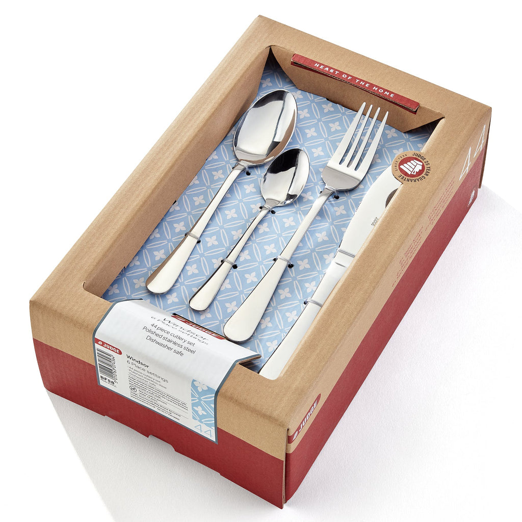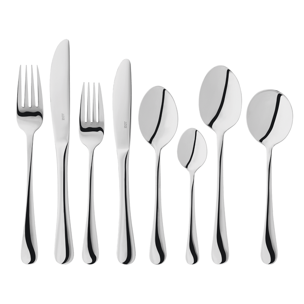 Contents: 6 table knives, 6 table forks, 6 soup spoons, 6 dessert spoons, 6 tea spoons, 6 dessert knives, 6 dessert forks, 2 serving spoons