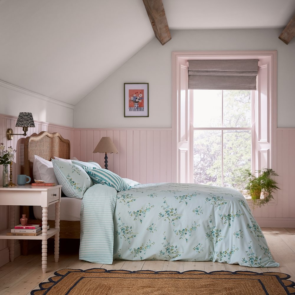 Bring easy elegance to your bedroom with this beautifully crafted bedding, featuring hand-painted blossom branches and a striped reverse for contrast. The soft aqua blue palette sets a calming tone, perfectly paired with the frilled-edge Candy Stripe cushion for a fresh,