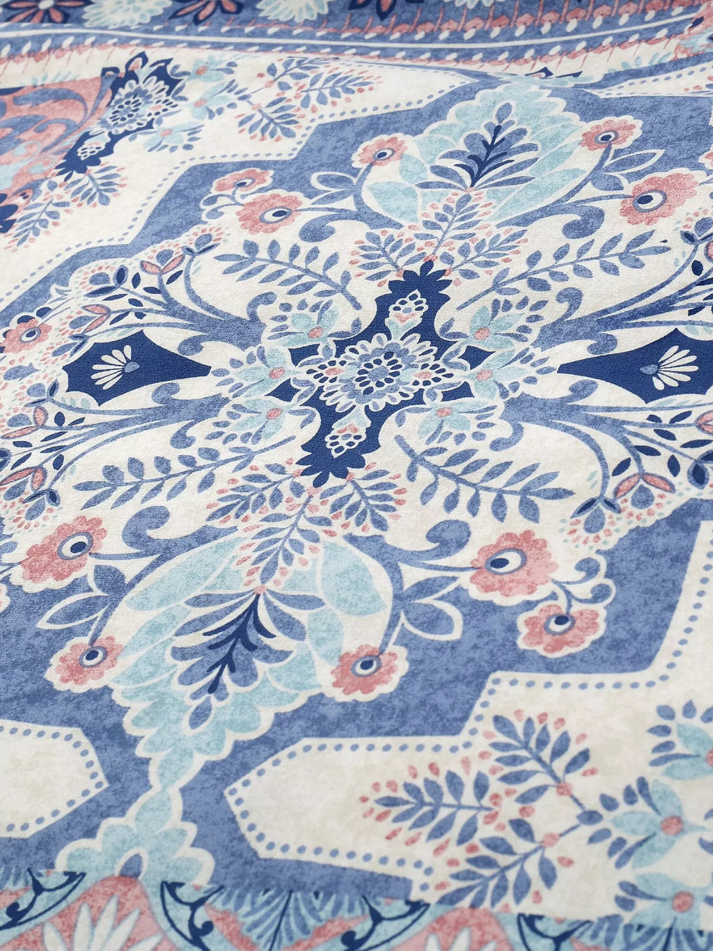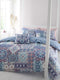 The print is brought to life by a patchwork design in shades of cream and blue with pops of pink. Intricate medallion patterns decorate the duvet leading to a unique visual effect that evokes the beauty of homemade blankets. For added versatility, the duvet cover can be flipped to reveal an alternative print.
