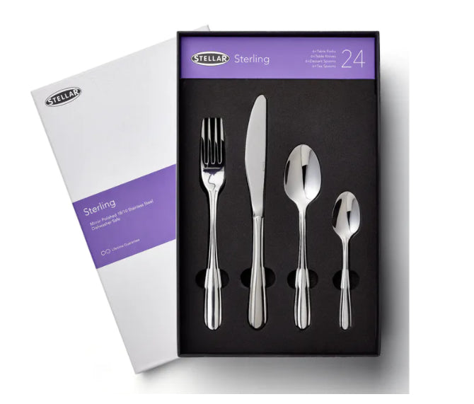 Contents: 6 table knives, 6 table forks, 6 dessert spoons, 6 tea spoons