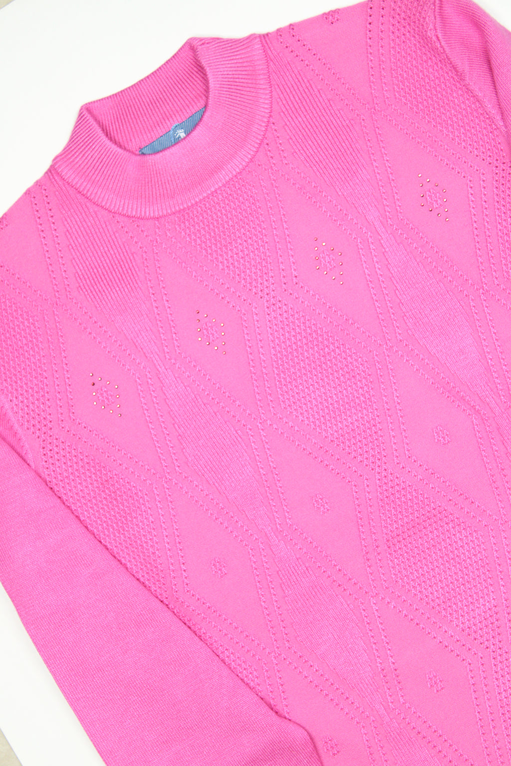 - Decorative knitting and rhinestone details.