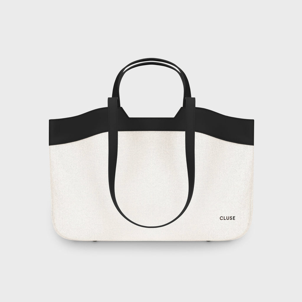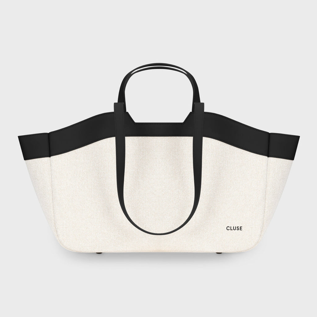 The versatile CLUSE Tote Bag for women in beige and black seamlessly blends style and functionality for work, travel and daily adventures. Crafted from stain-resistant coated canvas with PU details. Measuring 59 x 32 x 17 cm with a 13-liter capacity. Its foldable sides let you adjust the size as compact or spacious as you need. A magnetic closure with side snap buttons keeps your belongings secure yet accessible. Inside you'll find a matching detachable pouch for added organization. With both a short hand strap and a longer shoulder strap, you can carry the bag however suits you best - effortless and stylish.
