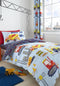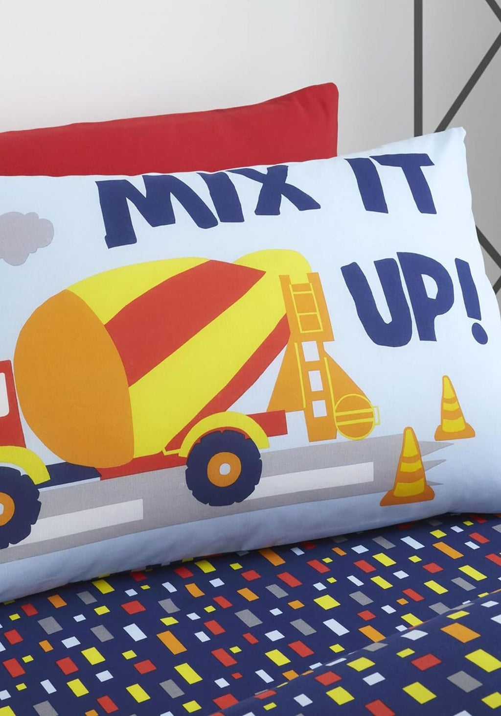 - Busy building, an array of brightly coloured trucks and cranes on a pastel blue base.