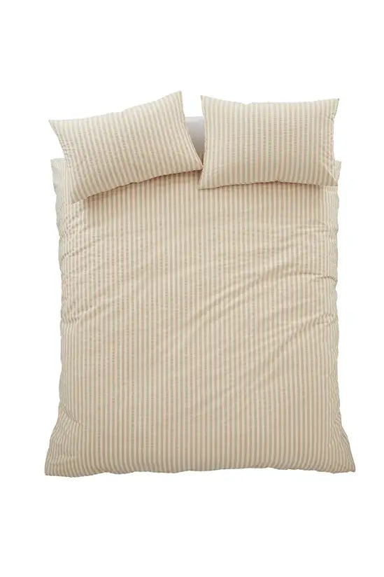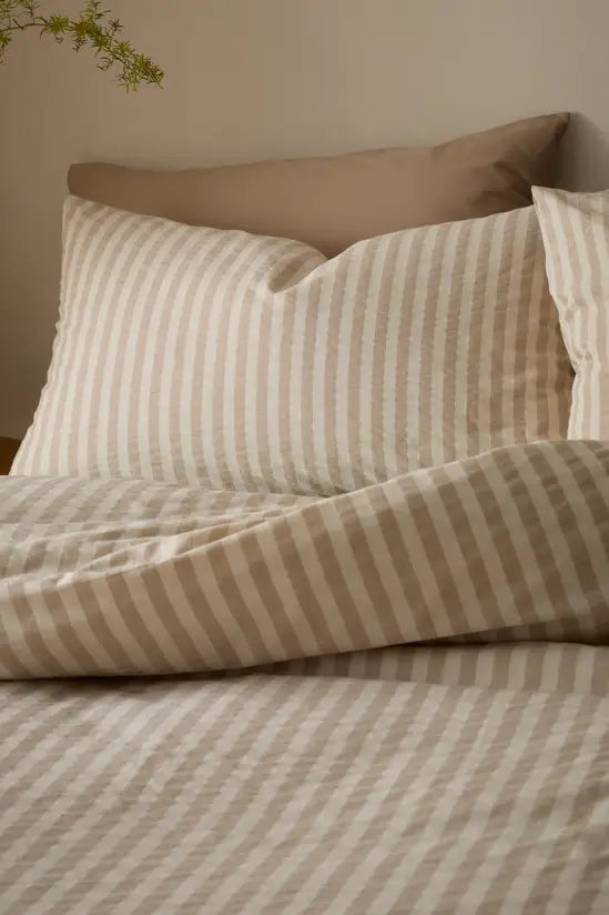 Transform your room into a serene retreat with this soft touch stripe bedding, featuring earthy tones that bring a sense of tranquillity. The carefully crafted stripes offer a subtle yet sophisticated pattern, blending seamlessly with any decor while adding a touch of rustic elegance. This inspired collection of eclectic designs is a fusion of influences from across the world with a modern interpretation of artisan motifs and timeless textures. Made to quality and human-ecological safety standards, in accordance with STANDARD 100 by OEKO-TEX.