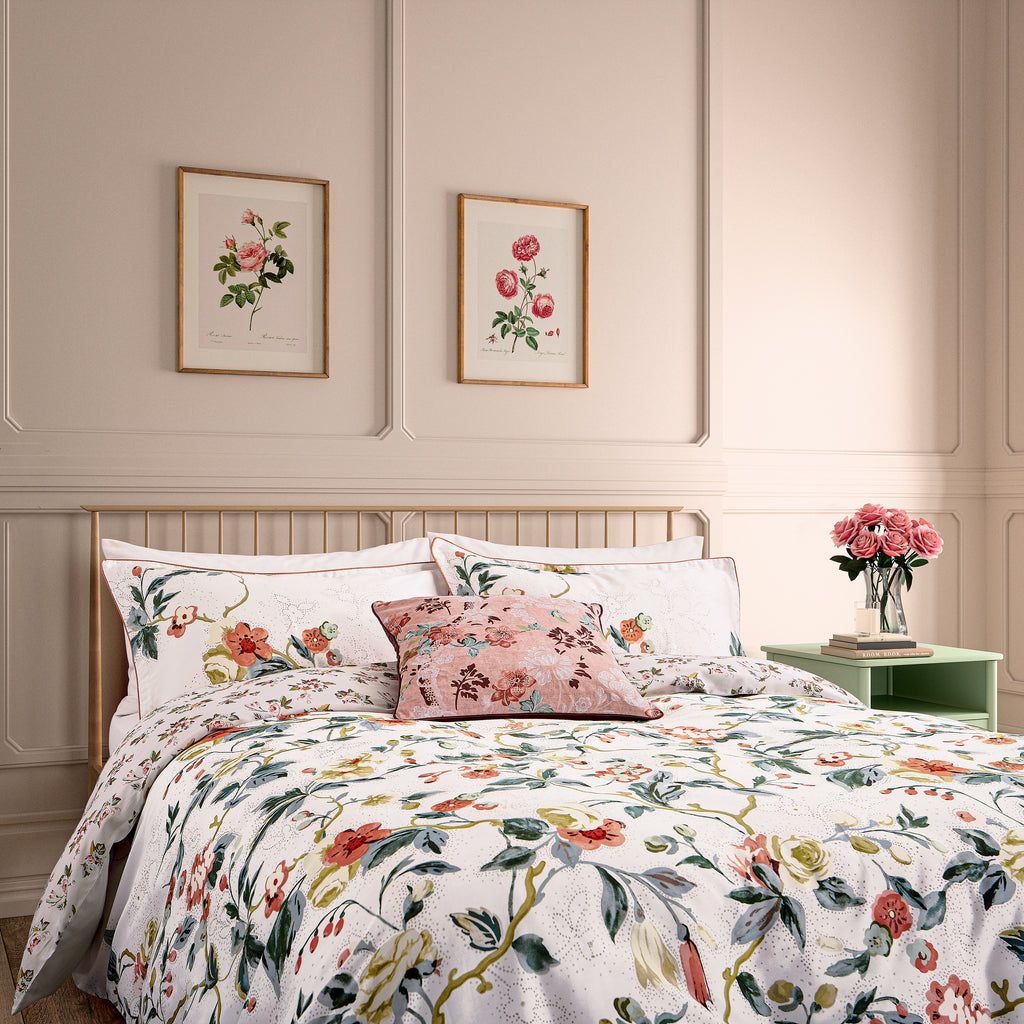 This beautiful design features an abundance of blousy, velvet blooms teamed with a delicate floral dot pattern, trailing across a white ground. Coloured in a palette of soft, chalky pink tones with a pale pink flower bunch print on the reverse, it has a nostalgic charm.