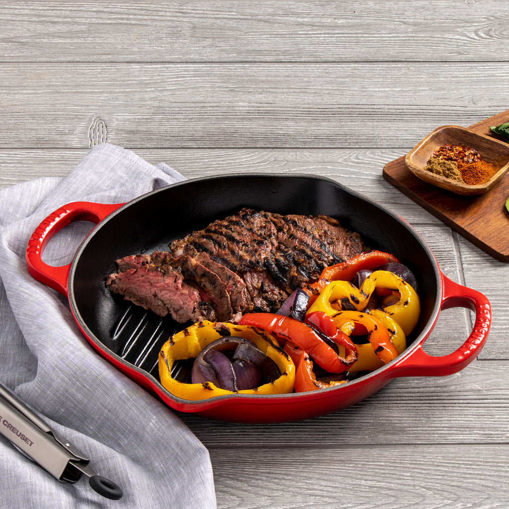 Le Creuset’s Signature Deep Round Grill is perfect for searing meat, fish or vegetables for larger gatherings, and roasting larger pieces of meat or poultry.