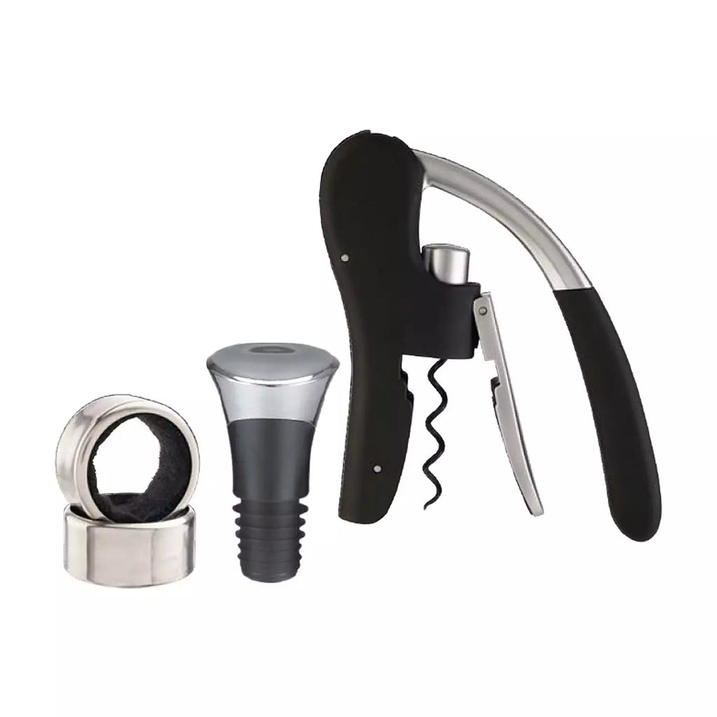 3 Piece lever corkscrew features two wine collars, a bottle stopper, and a lever arm corkscrew; an easy and ergonomic bottle opener.