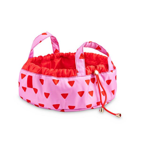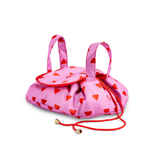A luxurious drawstring makeup bag that lies flat for easy access, with raised sides to prevent products from rolling out.