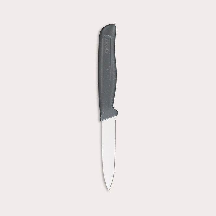 The Zyliss Paring Knife is designed for small chopping, trimming, and peeling tasks, featuring a straight blade for precision. The eco-friendly handle reduces plastic usage by up to 20%, utilizing sustainable wheat straw material. It is food and dishwasher-safe and includes an easy-insert blade guard for secure storage. Backed by a 5-year Zyliss guarantee, this knife is a durable and essential addition to any kitchen.