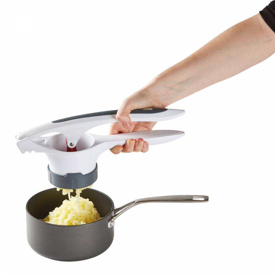 Plastic, with 2 sieve inserts made of stainless steel, fine and coarse, can be taken out for easy cleaning.