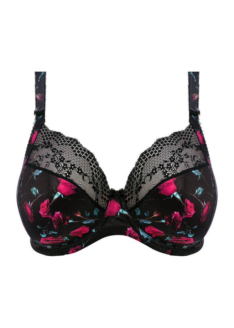 - Banded underwired plunge bra with three section printed cups plus side support panel for forward shape.