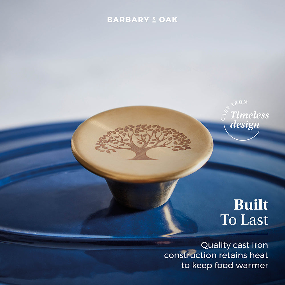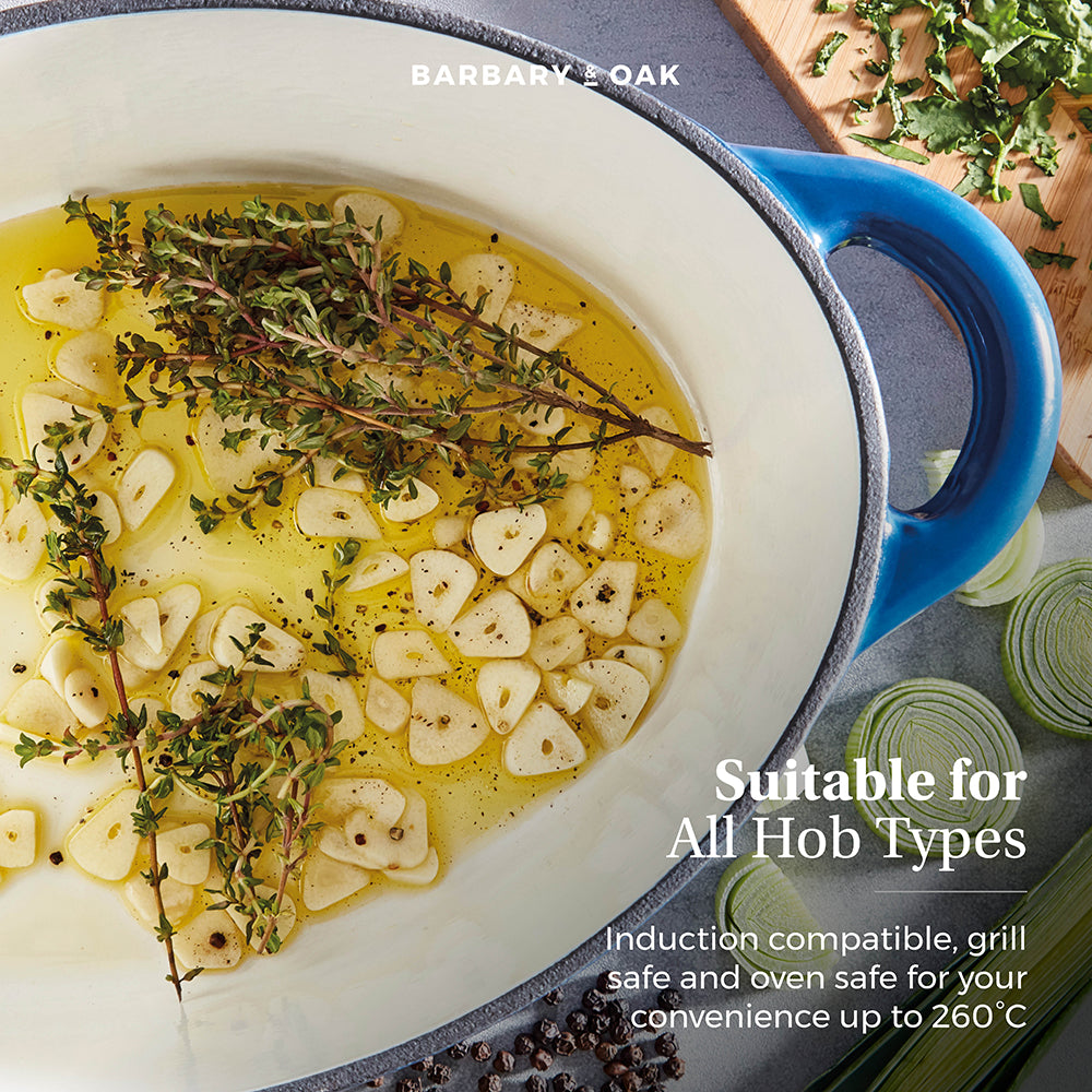 This Barbary Oak 29cm oval casserole pan is a reliable cooking companion that any avid cook needs in their kitchen. Featuring a quality cast iron construction, this material is highly durable and is built to last a lifetime, making it perfect for those who love to make delicious casseroles for all the family. This material also helps retain the heat, keeping your food warmer for longer and providing even heat distribution for better cooking results. The quality enamel interior coating prevents food from sticking and burning, making it easy to clean after an intense cooking session. A domed lid is included, which helps lock in and retain all the moisture to ensure your food is tender with an enhanced flavour. The handle is ergonomically designed, providing you with a comfortable and safe grip when cooking or serving. Versatile in its design, this casserole pan is suitable for all hob types and oven safe up to 260C.