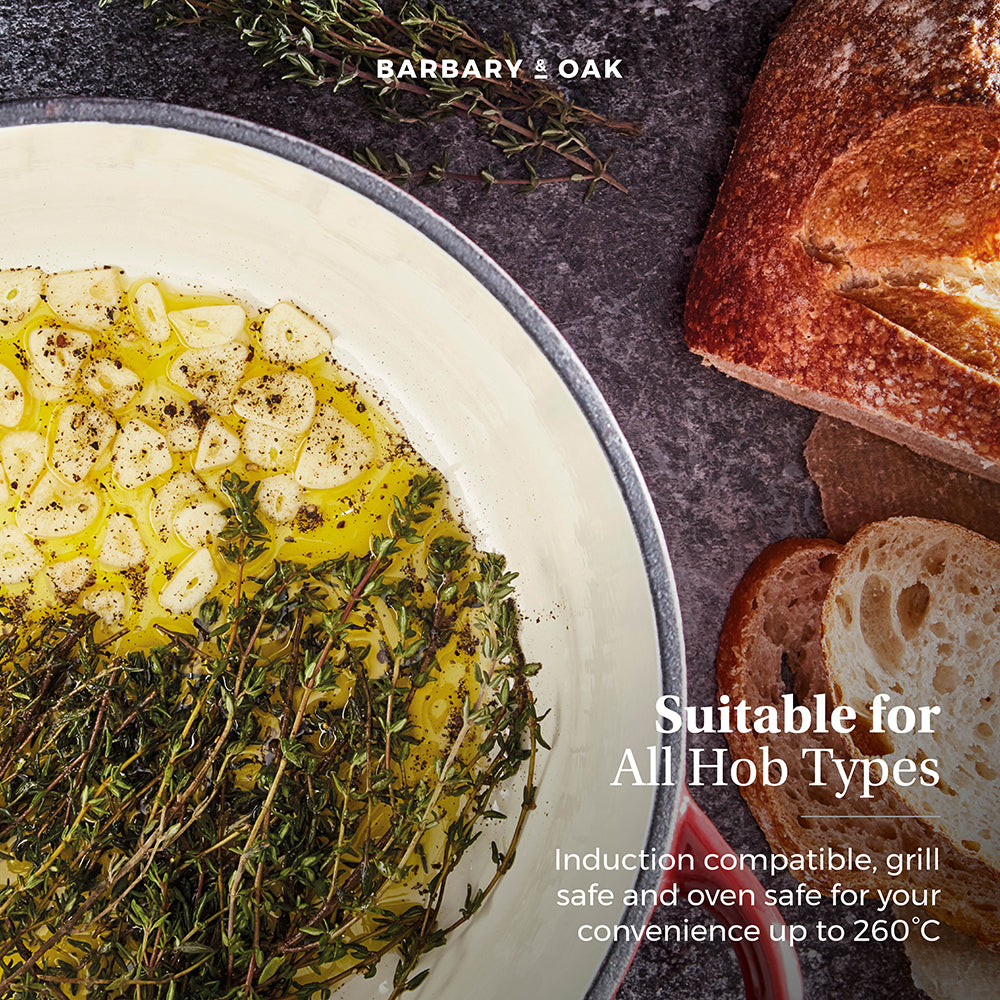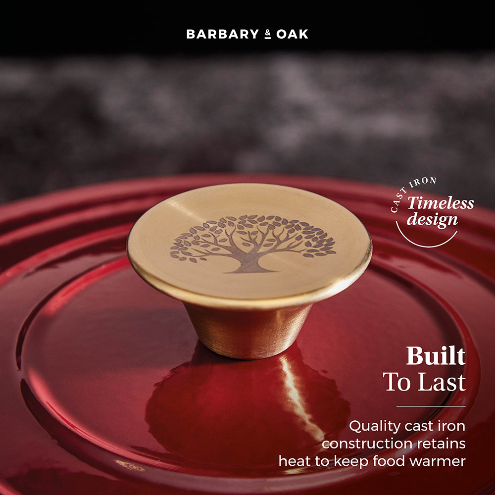 This Barbary Oak 24cm casserole pan is a reliable cooking companion that any avid cook needs in their kitchen. Featuring a quality cast iron construction, this material is highly durable and is built to last a lifetime, making it perfect for those who love to make delicious casseroles for all the family. This material also helps retain the heat, keeping your food warmer for longer and providing even heat distribution for better cooking results. The quality enamel interior coating prevents food from sticking and burning, making it easy to clean after an intense cooking session. A domed lid is included, which helps lock in and retain all the moisture to ensure your food is tender with an enhanced flavour. The handle is ergonomically designed, providing you with a comfortable and safe grip when cooking or serving. Versatile in its design, this casserole pan is suitable for all hob types including induction.