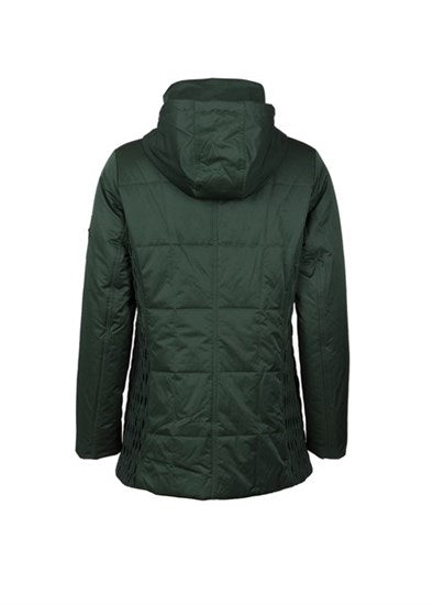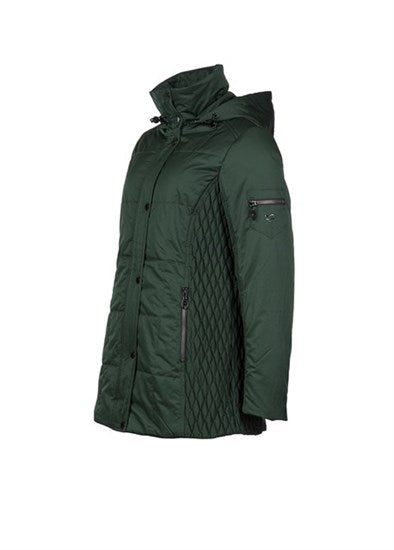 - High neckline with hood.