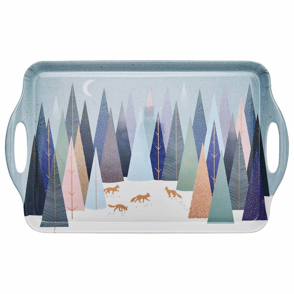 Serve up a festive winter feast for your guests with this charming Sara Miller London Portmeirion Frosted Pines print large tray. Made from stain resistant durable melamine, this large serving tray with handles is both beautiful and practical. It has a rimmed edge to help to keep everything in place, and a shimmering touch of gold on the foxes and trees ensures this tray is lovely enough for the most festive of winter gatherings.