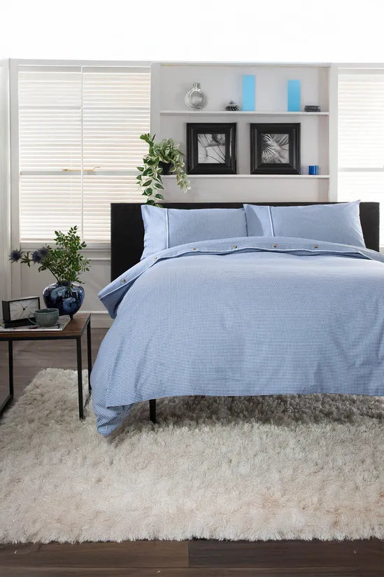 Enjoy daily comfort and timeless elegance with our Gingham Duvet Cover Set, made from 100% breathable cotton for a soft, natural feel throughout the seasons. The classic gingham design brings refined style to your bedroom, complemented by double piped edges for a neat, tailored look. Featuring mock horn button closures, this set combines subtle rustic detail with functional convenience. Durable and easy to maintain, it includes a duvet cover and coordinating pillowcase(s) for a seamless bedding update. 100% Cotton, machine wash, tumble dry.