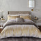 The Motion duvet cover features a gold painterly Ikat stripe woven on a pale grey ground with a plain co-ordinating reverse and finished with button fastenings.