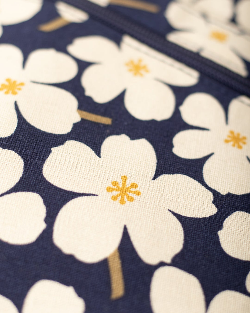 This bag is made from tactile brushed cotton and features a cute graphic daisy print on a navy background.