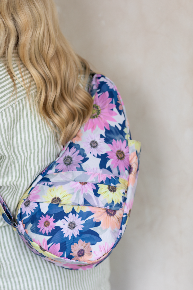 A timeless bag with a delicate floral print of soft pinks, blues, and yellows. Made from 100% recycled polyester and printed with Oeko-Tex® approved dyes. Our recycled polyester material is made from post consumer waste like plastic bottles! Machine washable.