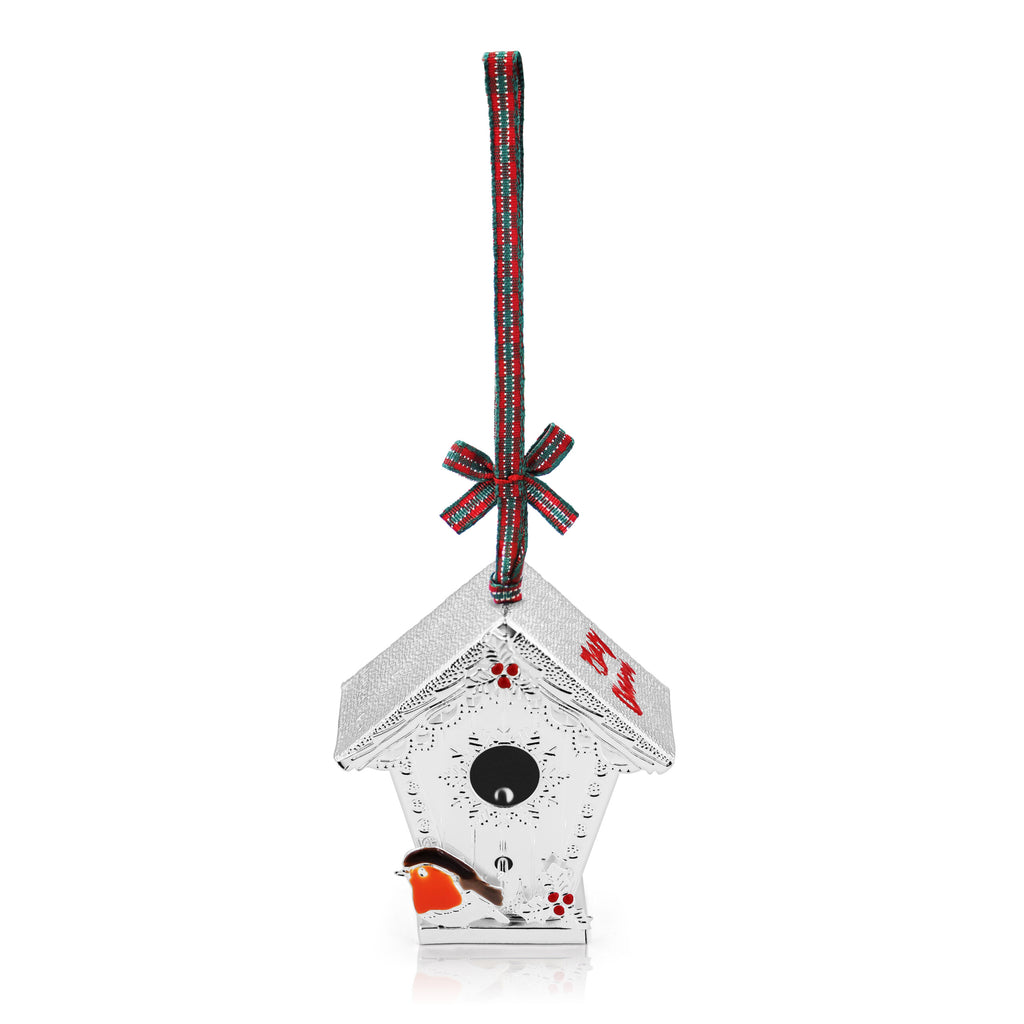 This elegant silver-toned decoration features a robin that adds a vibrant touch of colour.