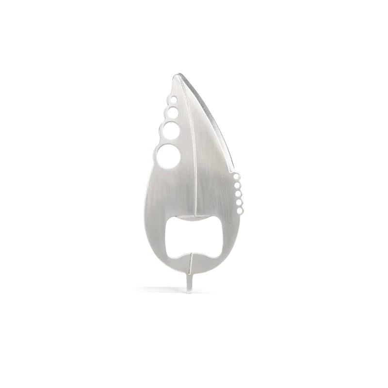 Multi-tool to zest (zester), remove herbs from twigs (herb stripper), peel (citrus peeler), cut (rocking blade) and to open beer bottles (bottle opener).