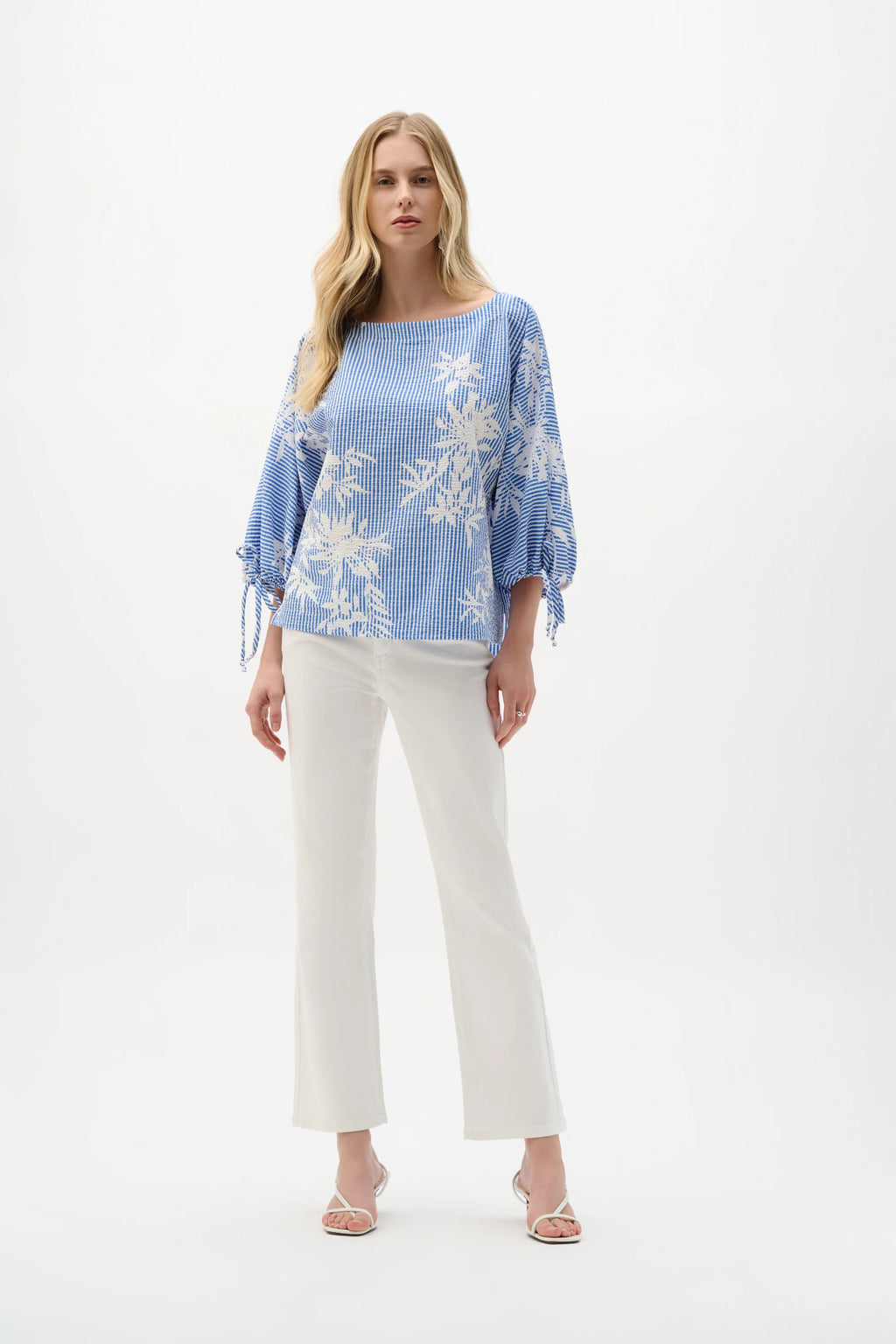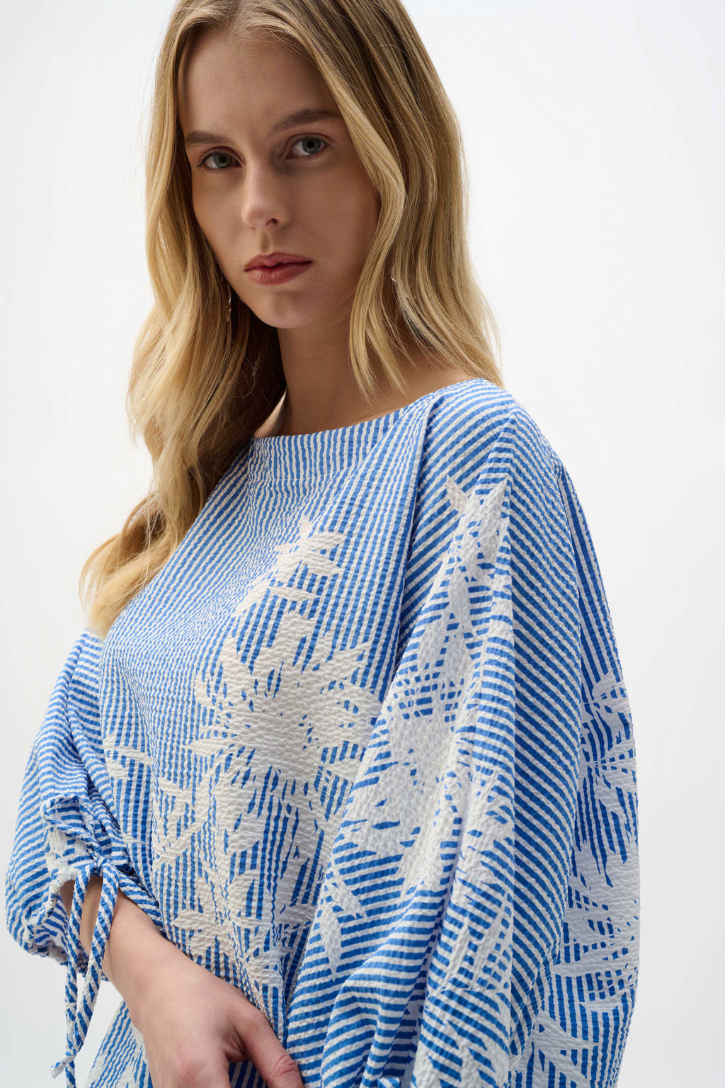 - Three-quarter puffed dolman sleeves with bow tie accents