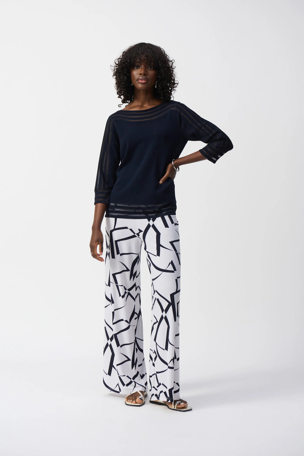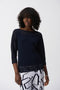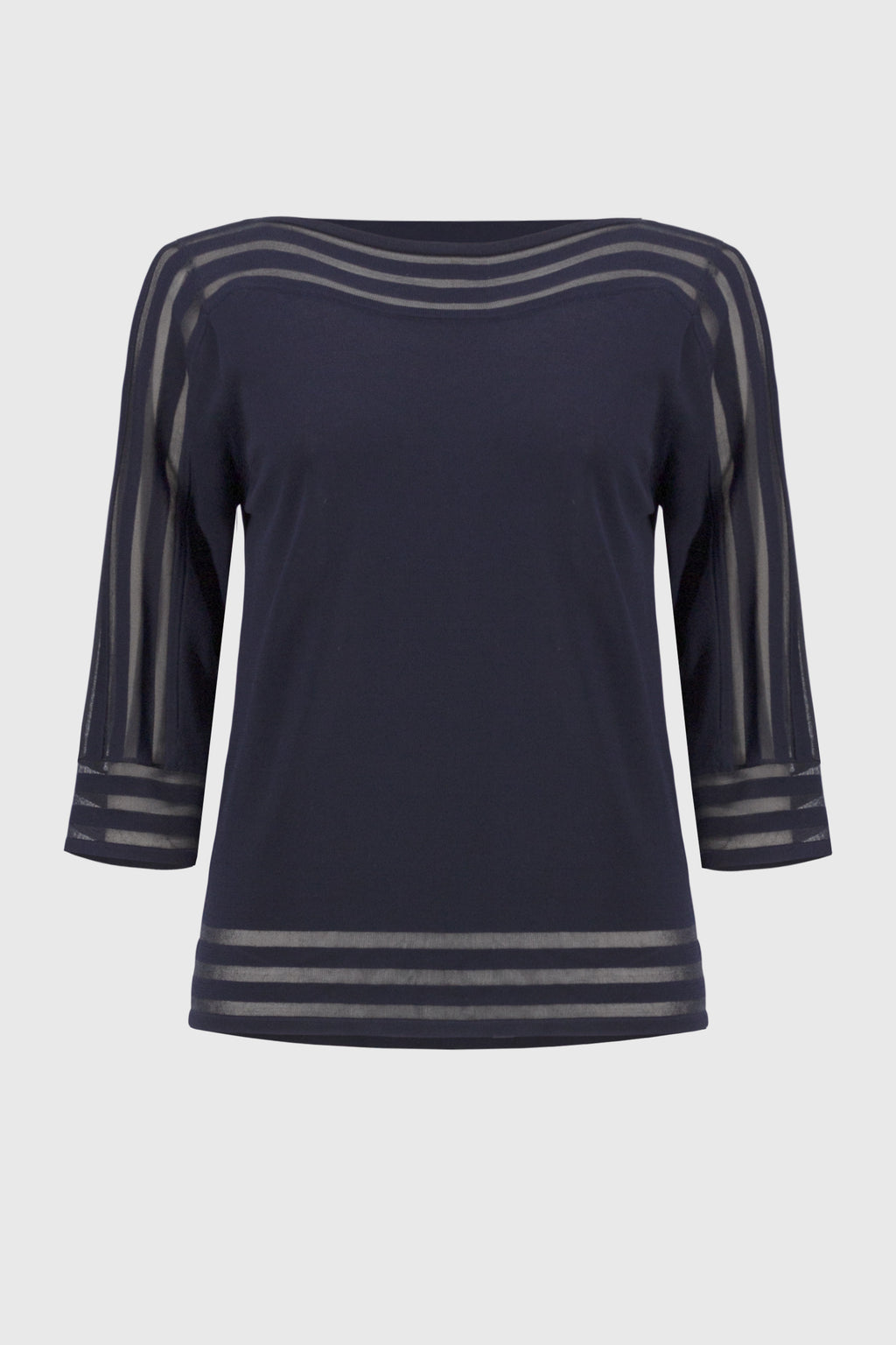 - Yarn mesh stripes at neck, sleeve hem and bottom hem