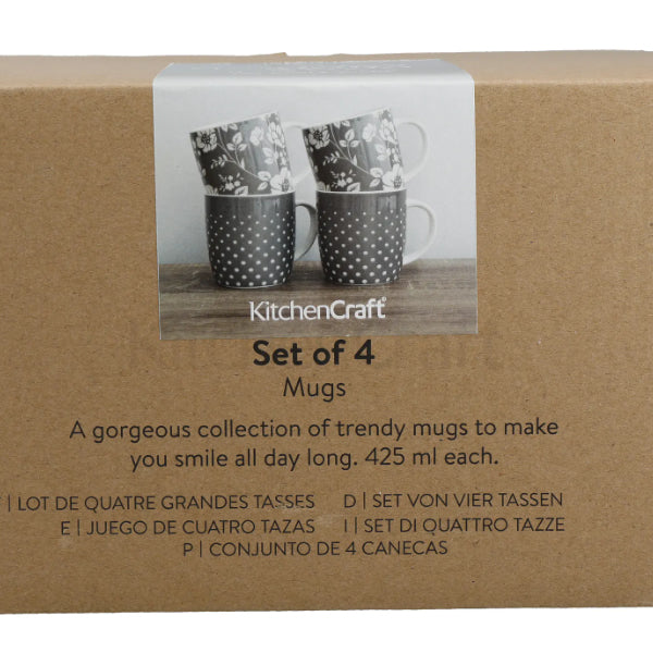 This 4-piece kitchen mug set from KitchenCraft comes in a classic scheme of white polka dots and floral designs on a grey backdrop. Featuring 2 mugs in each design, they're perfect for use in social occasions. The porcelain barrel-shaped mugs have a generous capacity of 425ml (0.5 pint, 14.5 fl oz).