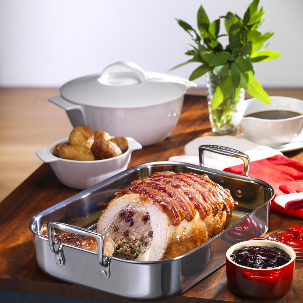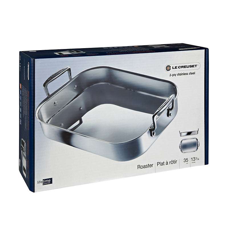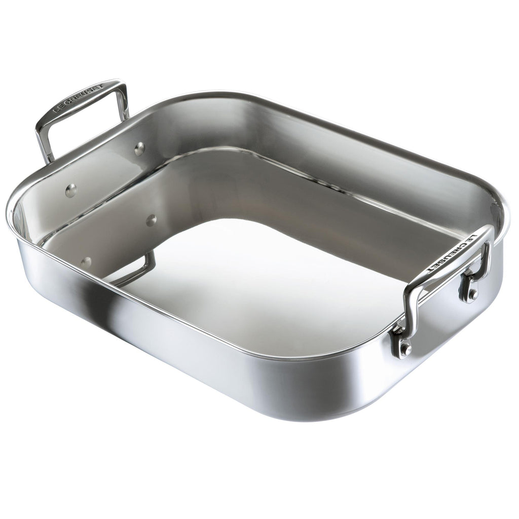 Le Creuset stylish 3-ply Stainless Steel Roaster is a must-have for keen cooks looking to invest in versatile and long-lasting cookware which will perform time after time. It is perfect for roasting, baking, poaching and bain-marie cooking and its upright handles make it easy and safe to lift when full. The generous size is well-suited to cooking a traditional roast and it can be used on the hob to make delicious gravy with the meat juices after cooking. Use with the Le Creuset non-stick Roasting Rack (available separately) for healthier, lower fat roasting.