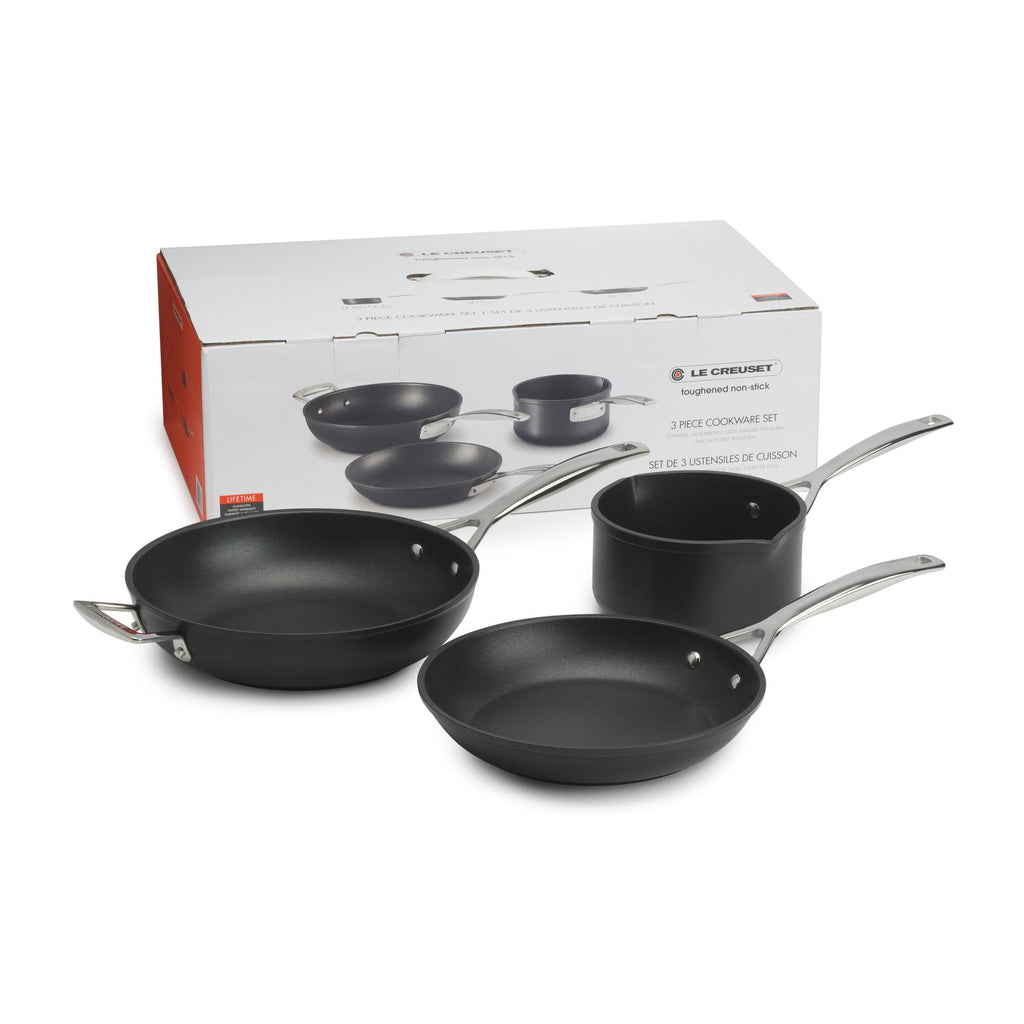 NEW from Le Creuset, their best-ever non-stick coating.  Now 4 x stronger*, the new 3-layer reinforced non-stick coating on the inside of every Le Creuset Toughened Non-Stick is now even more durable and resistant to abrasion from metal utensils.  The Toughened Non-Stick Shallow Casserole is perfect for everyday cooking for a variety of quick and tasty meals but is equally at home being taken straight from the hob to the table for an informal supper with friends. The perfect introduction to the Toughened Non-Stick range, the 3 Piece Cookware Set contains a 16cm Milk Pan, 24cm Shallow Frying Pan and 26cm Deep Frying Pan.