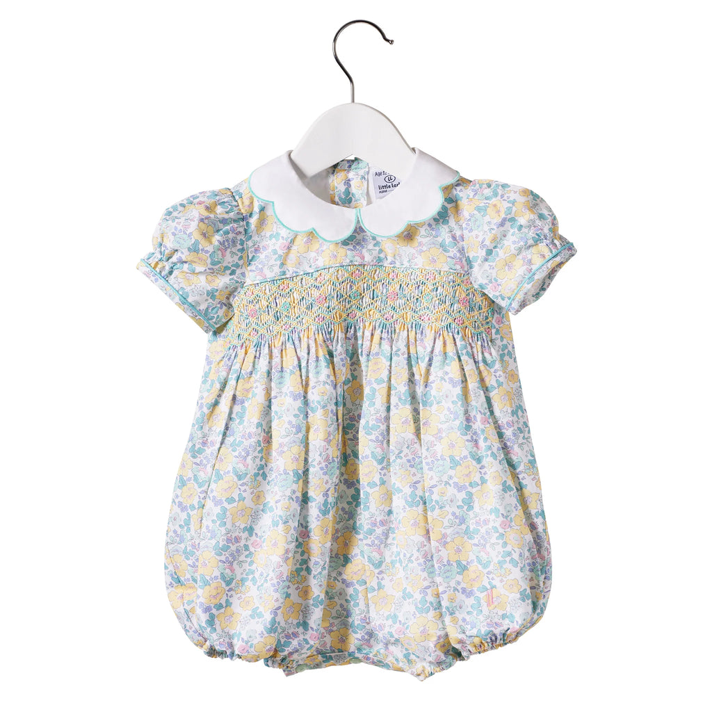 • Smocking runs across chest.