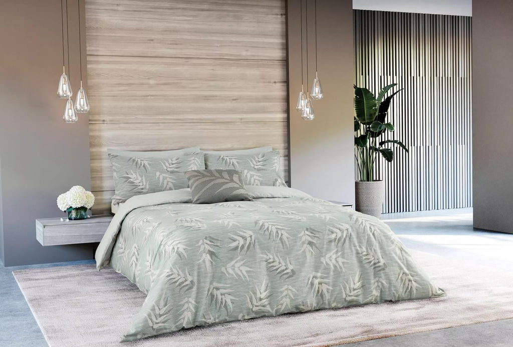 With colour inspiration taken from the misty hues of the Kohala rainforest in tones of sage green & misty whites, Malu presents an all over hand painted leaf pattern with subtle shadows and fine linear textures. A fine linear pattern on the reverse in light green and grey complements beautifully. Complete the look with the dark green leaf design cushion in poly velvet with foil detailing. The bedding is treated with a calendar finish creating a smooth and sleek more lustrous finish perfect for added luxury.