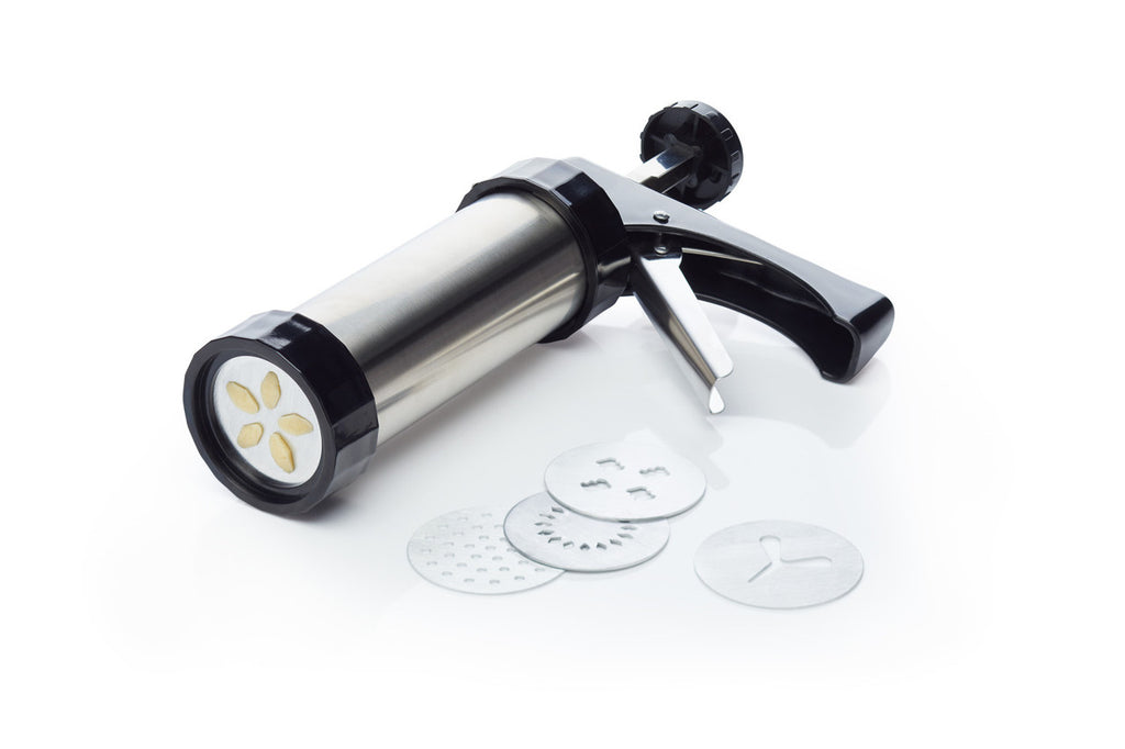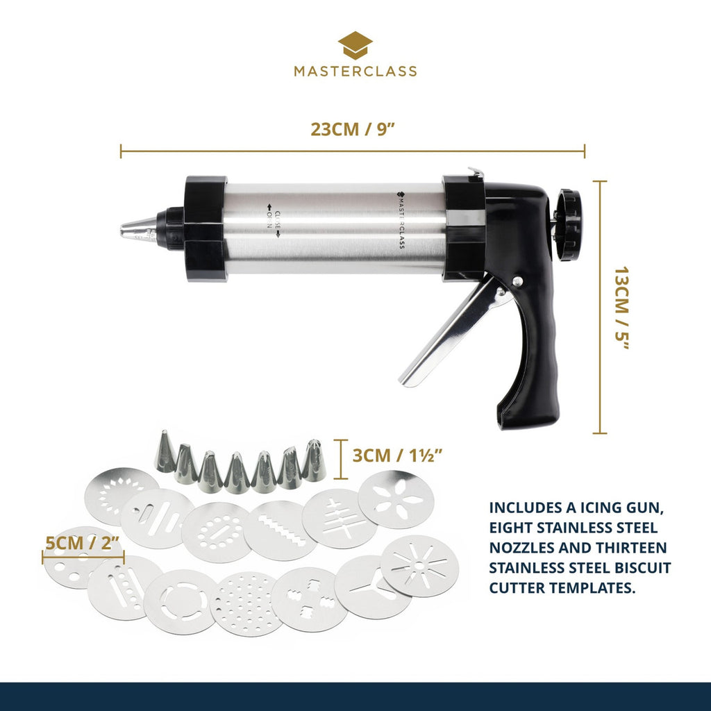 This dual-purpose icing gun / biscuit press set makes it quick and easy to achieve professional results at home. It’s great for baking beginners, committed home chefs and even professional bakers. The icing gun is made of durable stainless steel with heavy-duty plastic parts, while the icing nozzles and biscuit templates are all made of stainless steel. This 22-piece set features eight stainless steel icing nozzles that attach easily onto the icing gun, so you can pick from a variety of shapes to frost and decorate your cakes. Or simply attach one of the 13 stainless steel cookie cutter templates to create perfectly shaped biscuits in seconds. It’s great for spritz cookies, as well as other delicious favourites. And with a variety of shapes including Christmas trees and flowers, you can bake a batch of treats for any special occasion. The icing gun has an adjustable trigger action nozzle, so you have complete control over the sweet treats you create.  Nozzles and templates are dishwasher safe — All other items are hand-wash only.