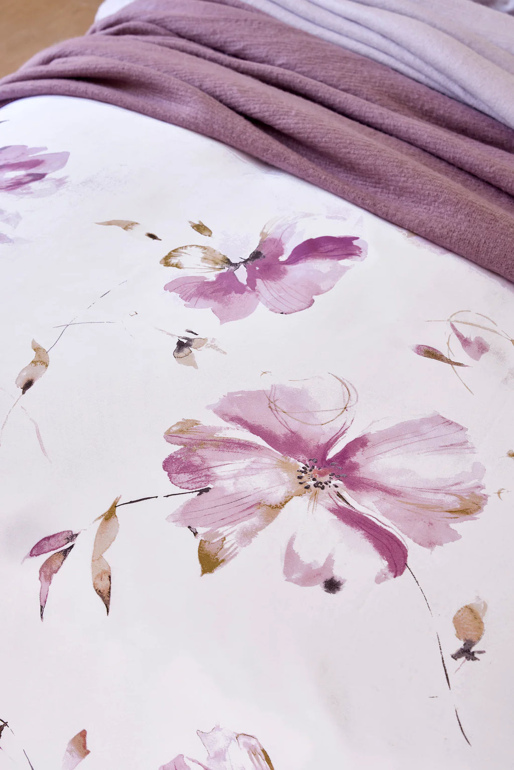 Beautiful, oversized Clematis flowers in soft rose shades are scattered across this bed linen design. Delicately hand painted and printed onto smooth white cotton sateen fabric, Matsu will add a striking, yet sophisticated feminine touch to your bedroom. This product is MADE IN GREEN certified by OEKO-TEX® showing it been sustainably made.