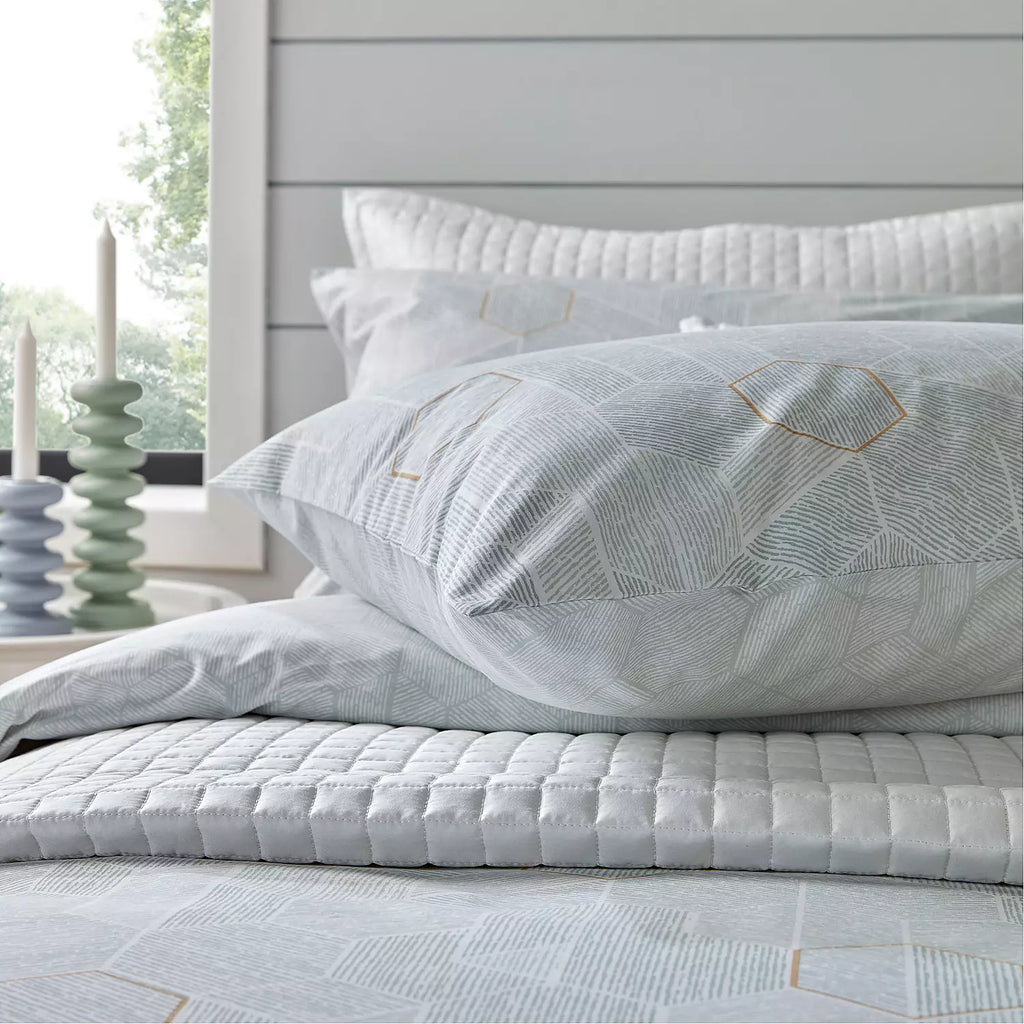 Inspired by designs from our archives, Meeko features an all-over honeycomb pattern which is modernised with a sketched striped detail. This creates a subtle geometric pattern which is so easy to live with and continues to be popular within home interior trends. This product is MADE IN GREEN certified by OEKO-TEX® showing it been sustainably made. Available in Mint & Silver colourways. Duvet set includes pillowcase(s)