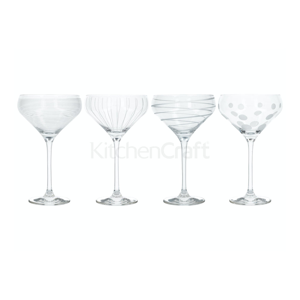 Party in style with this set of four champagne saucers from tabletop industry leader Mikasa. Be unique with precision-etched designs in a sophisticated, coordinating collection. Made of stunning crystal glass, each champagne glass is decorated with it's own distinct, celebration-ready design. Guests will be delighted when you serve them bubbly or sparkling wine in their own glass, etched with shimmering silver sweeps, loops or dots. You Don't have to save them for parties, though. Bring them out when you're celebrating good news - whether with friends or a loved one. This set comes in a beautiful gift box, making it a wonderful gift for anyone who loves to entertain, or who simply appreciates elegant glassware.