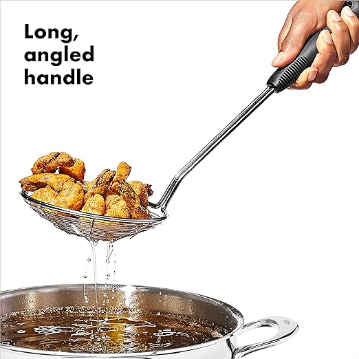 Engineered with a wire coil, the OXO Scoop and Strain Skimmer prevents food damage when scooping or sifting blanched, boiled or fried foods. Its deep, open basket delivers efficient straining. The long angled handle allows for comfortable use.