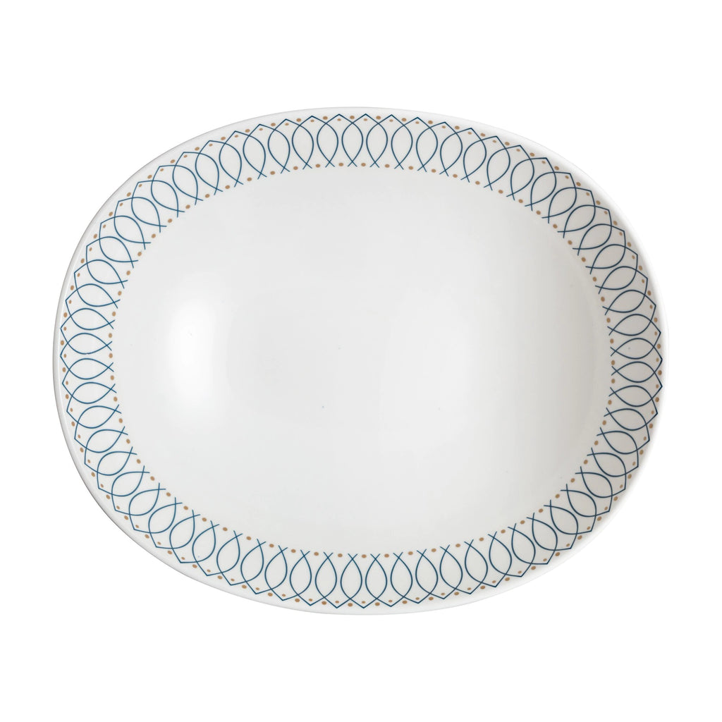 Drawing inspiration from Art Deco influences of bold geometric shapes, sweeping curves and sunburst motifs. Fine, yet strong, this stunning porcelain serving bowl features a beautiful geometric pattern on the inside of the bowl, and an 'arc' texture on the outside of the bowl giving it a modern and unique feel. A real statement piece, this ellipse shaped bowl makes a beautiful addition to the table, and is perfect for pasta, salad or can be used as a fruit bowl. Style with Denby's Arc Blue or Modern Deco porcelain ranges. Dishwasher, microwave and freezer safe as well as oven safe to 230°C.