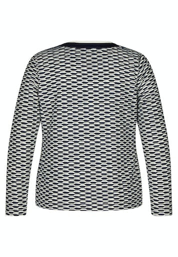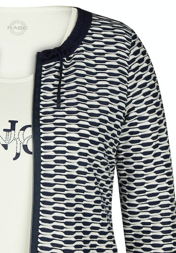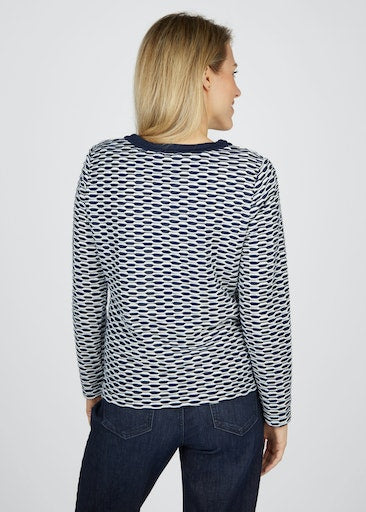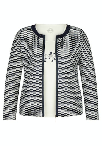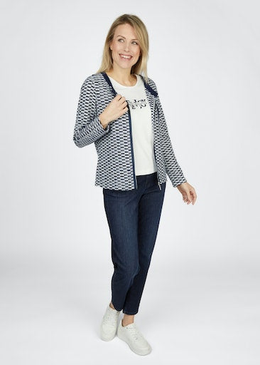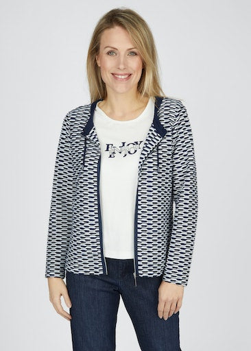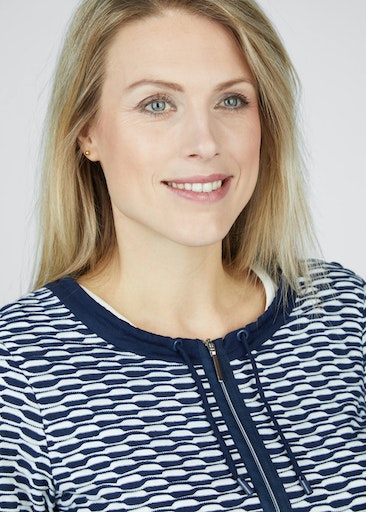 - Navy neck and zip hem.
