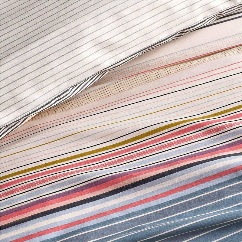 Using colour and scale of the stripes create an impactful and youthful look. Small spot patterns are featured throughout, whith small pin stripes on the reverse add to the contrast.