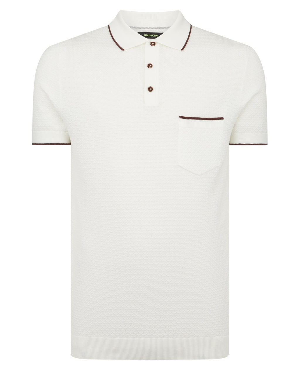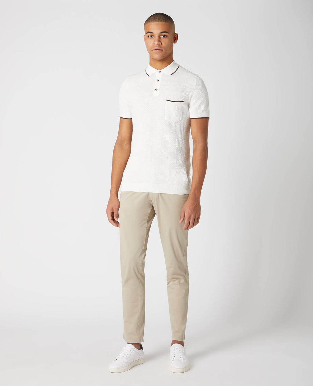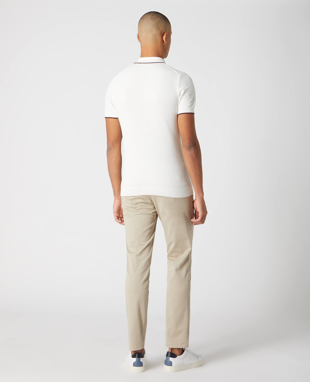 - Polo collar with contrast trim.