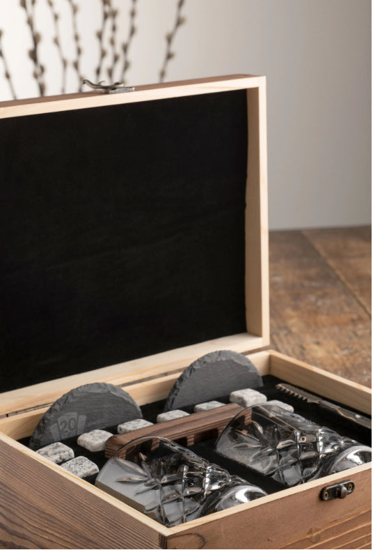The Renmore wooden boxed whiskey gift set is the ultimate gift set for any whiskey enthusiast. All whiskey lovers will feel like they are the classiest whiskey drinker around with our stunning set. They will have everything they could ever need to enhance and experience the flavour of their whiskey. This is an ideal gift for any occasion.