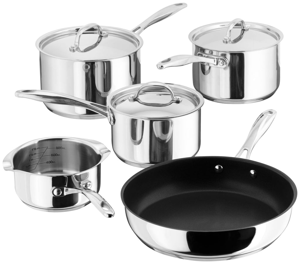 - Set includes 14cm milkpan, 16, 18 and 20cm saucepans and a 26cm non-stick frypan.