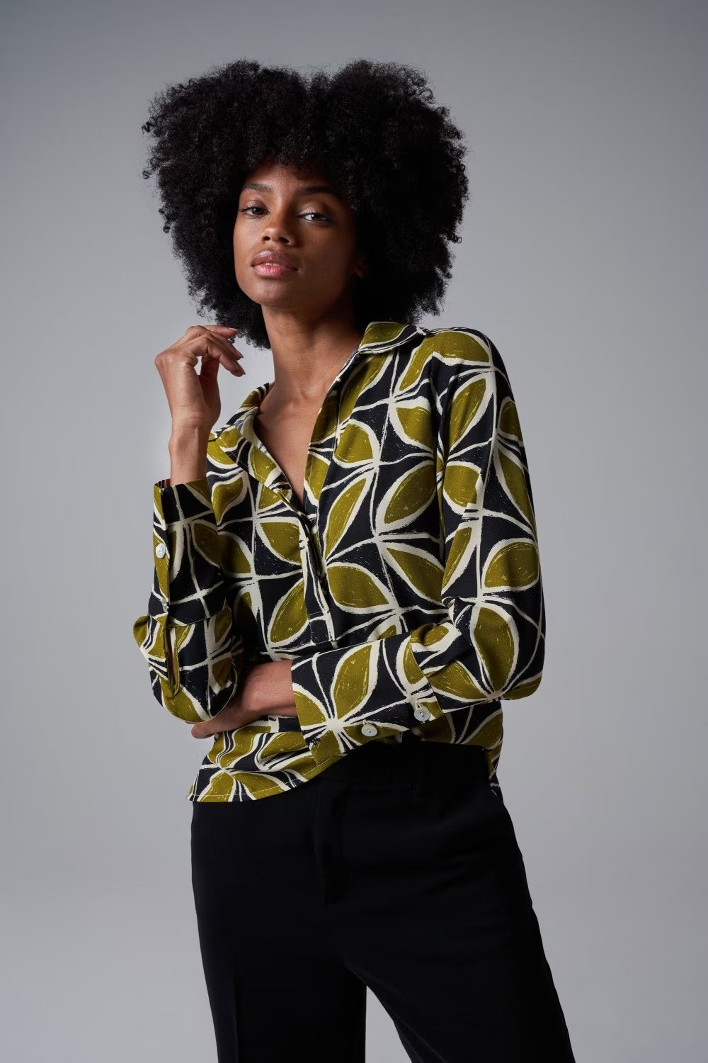 • Long sleeves with buttons at cuffs.
