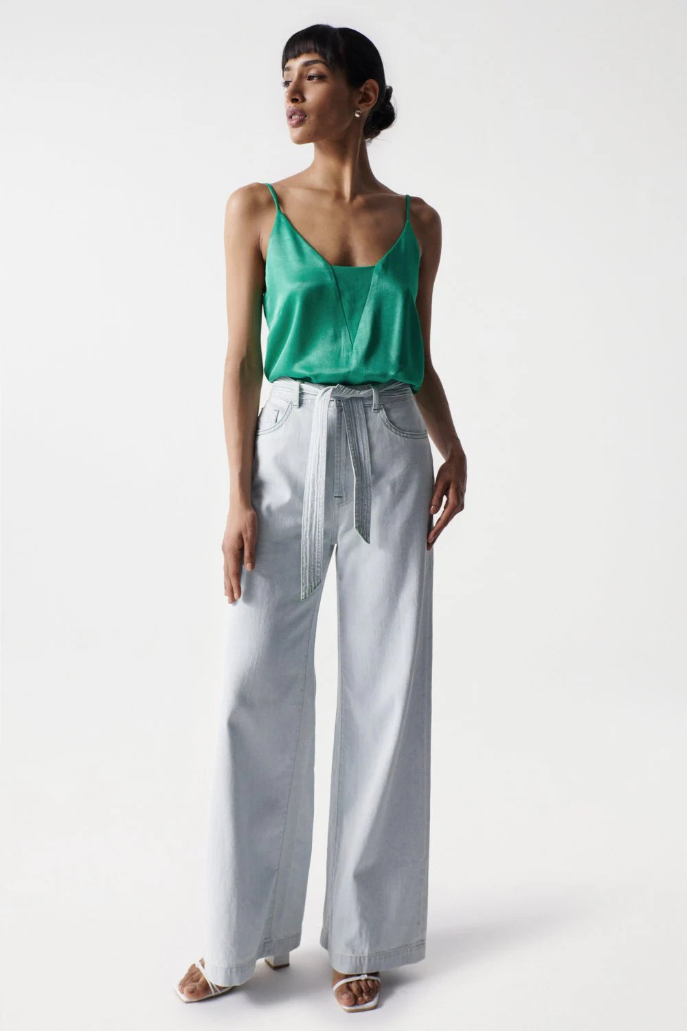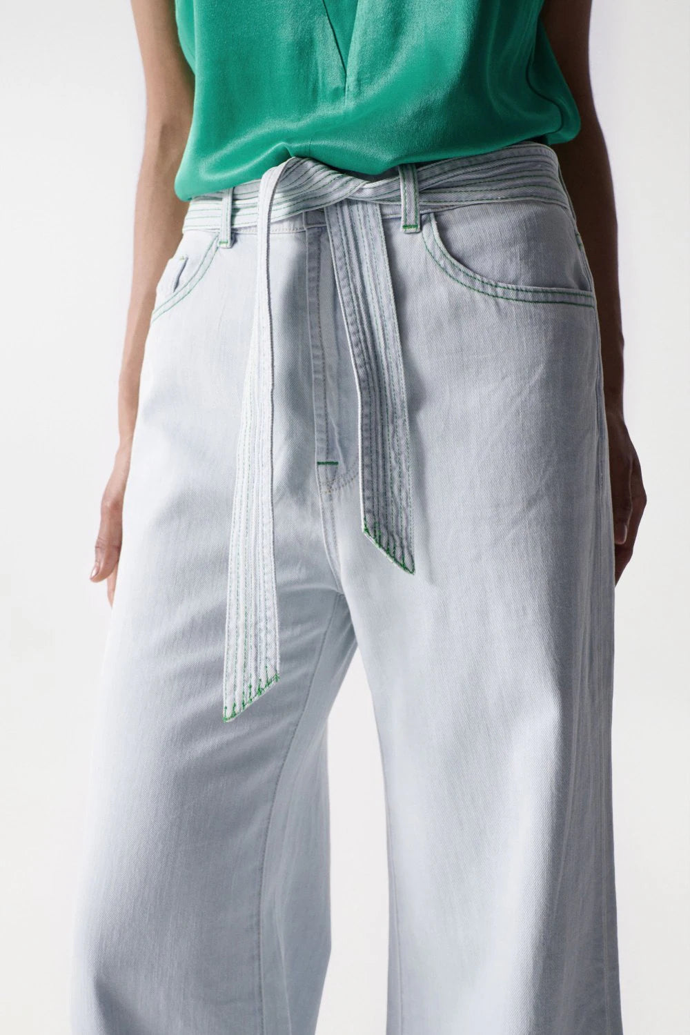 - Adjustable denim belt detail.