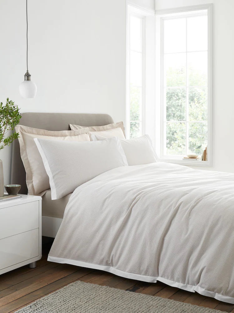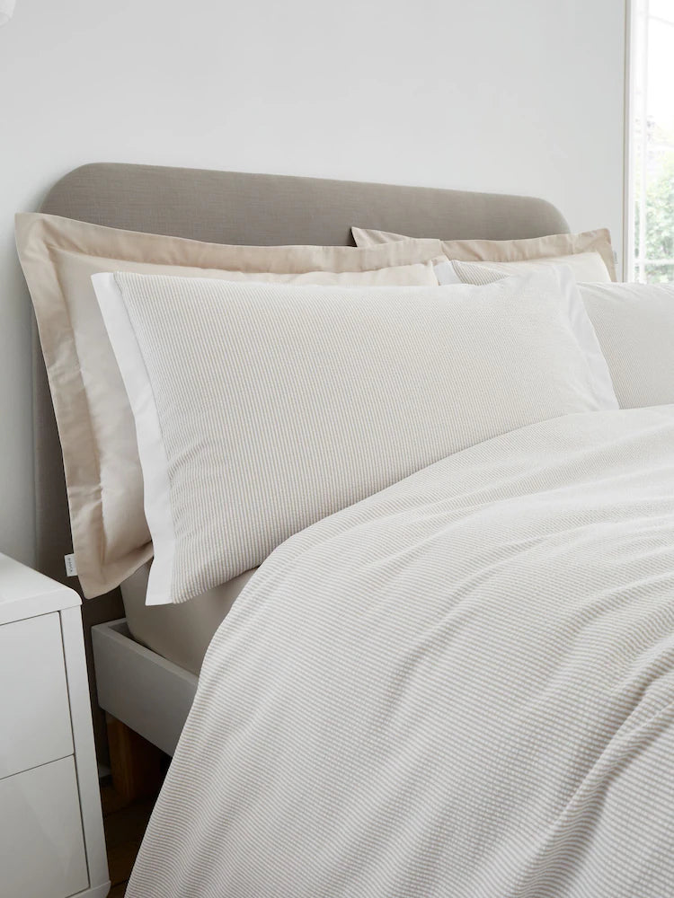 Elevate your sleep space with the effortless texture of this woven seersucker duvet set, creating a soft and calming space. Designed with subtle tonal stripes, this set blends laid-back sophistication with breathable comfort, perfect for creating a calm, contemporary retreat. Dream in blissful comfort under wonderfully soft 200 thread count percale cotton, a beautiful naturally breathable fibre that encourages a better night’s sleep.