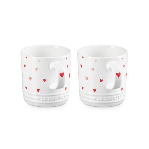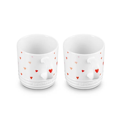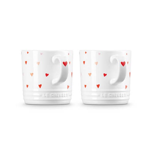 The Le Creuset Set of 2 Heart Decal Mugs are adorned with a stunning Heart Decal design featuring red and pink hand painted watercolour like hearts on a white background.