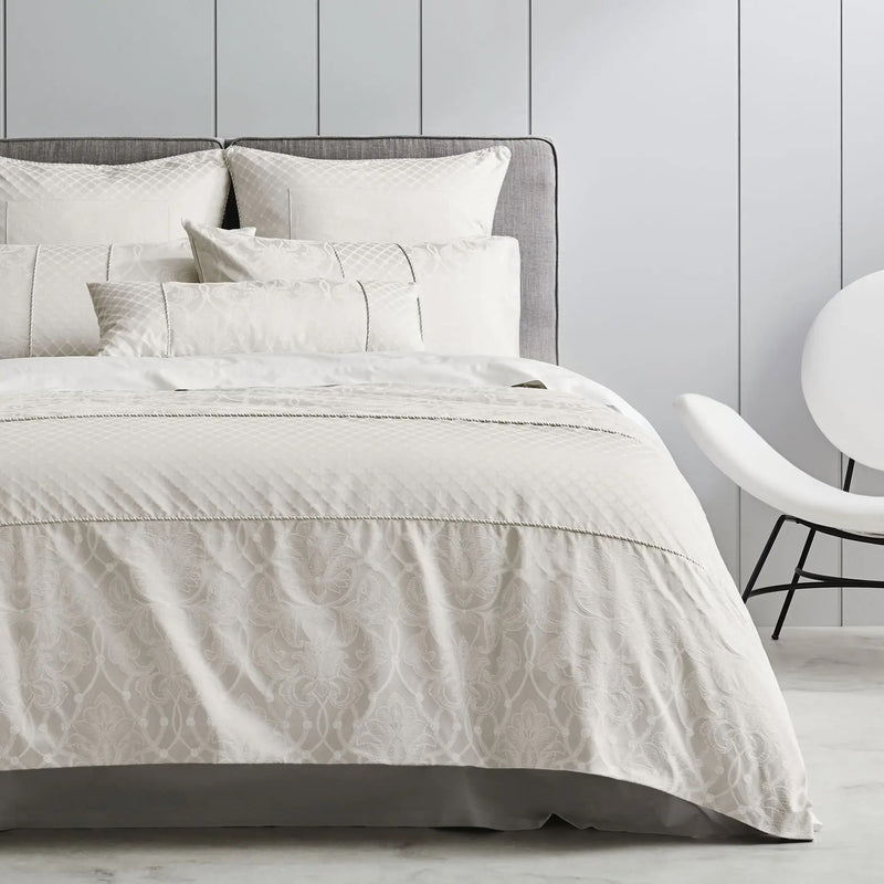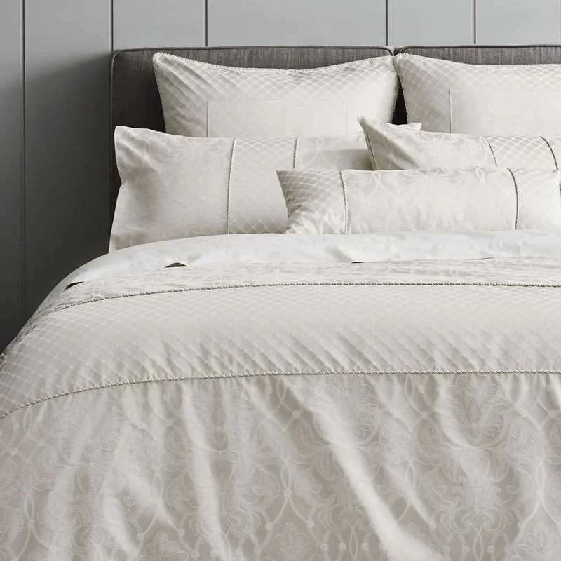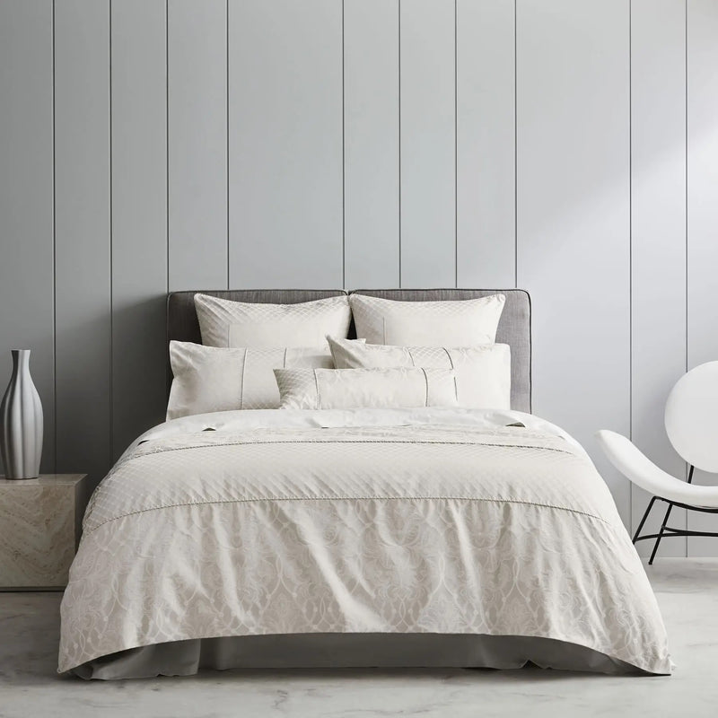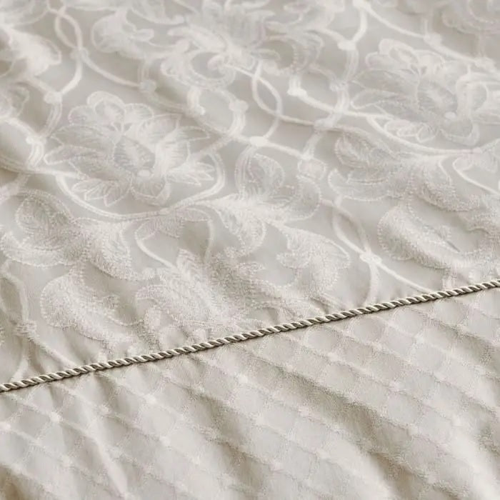The intricate floral design works alongside the simple diamond geometric pattern, with the cotton rich jacquard weave providing a sense of touch and feel, while the sand wash effect and chalk colourway soften the effect and add to the cosyness.
